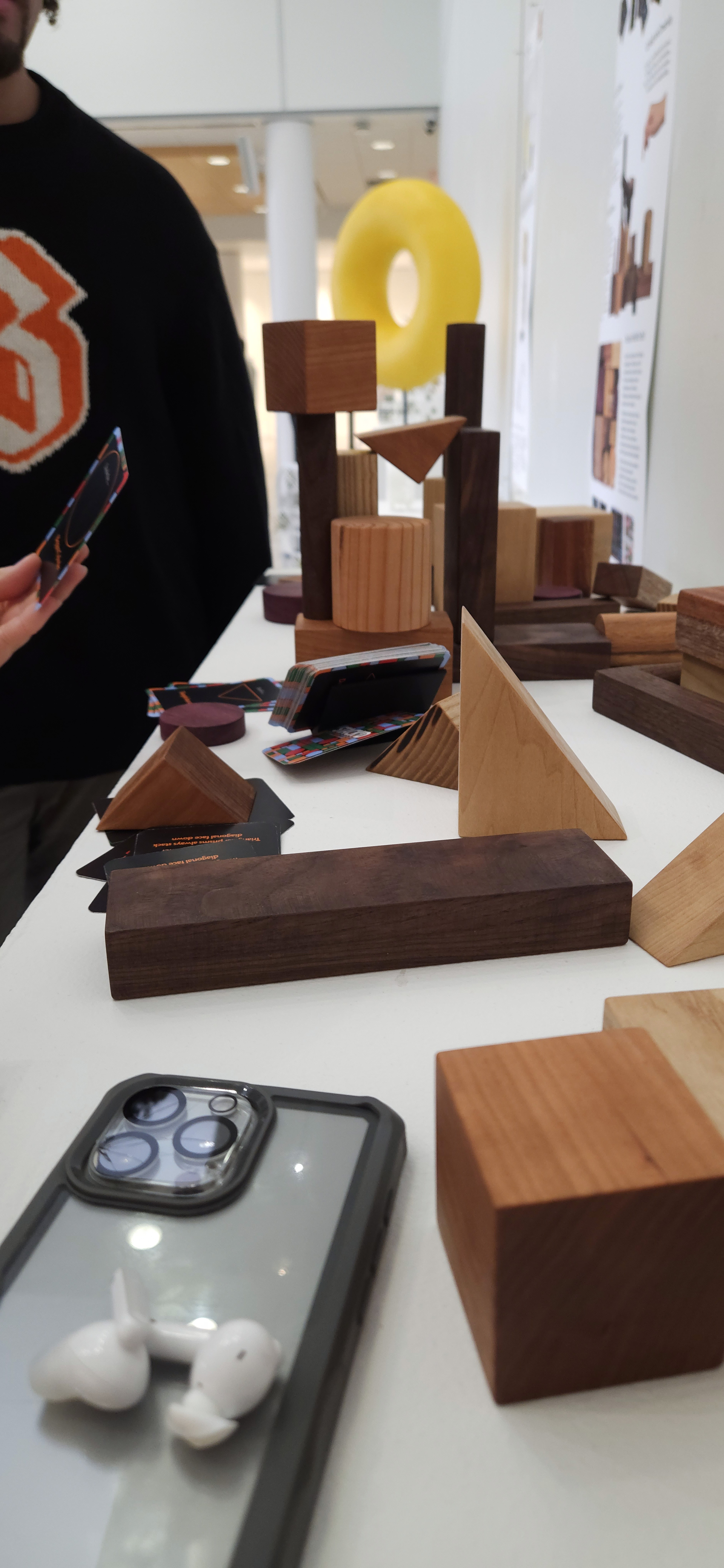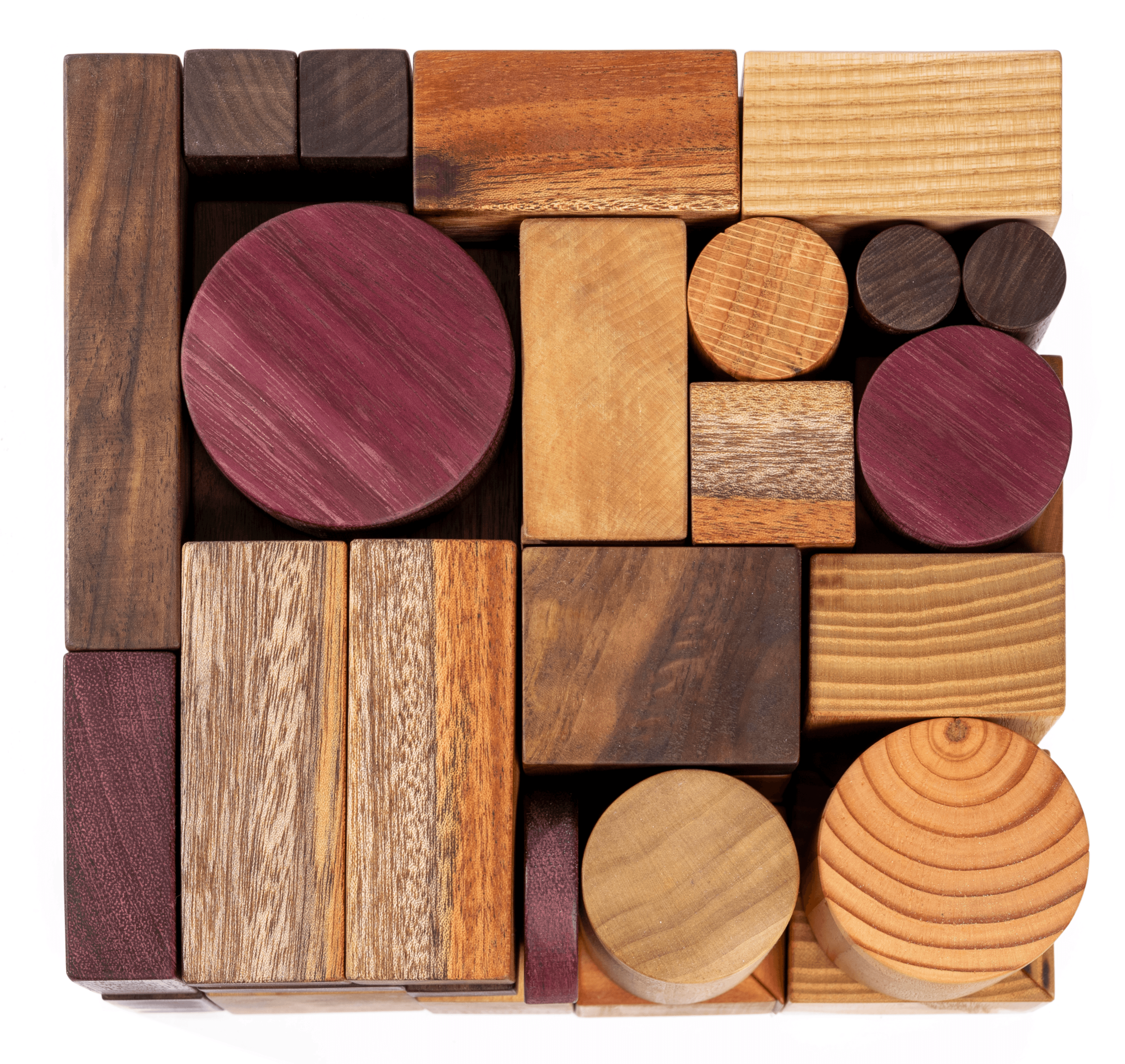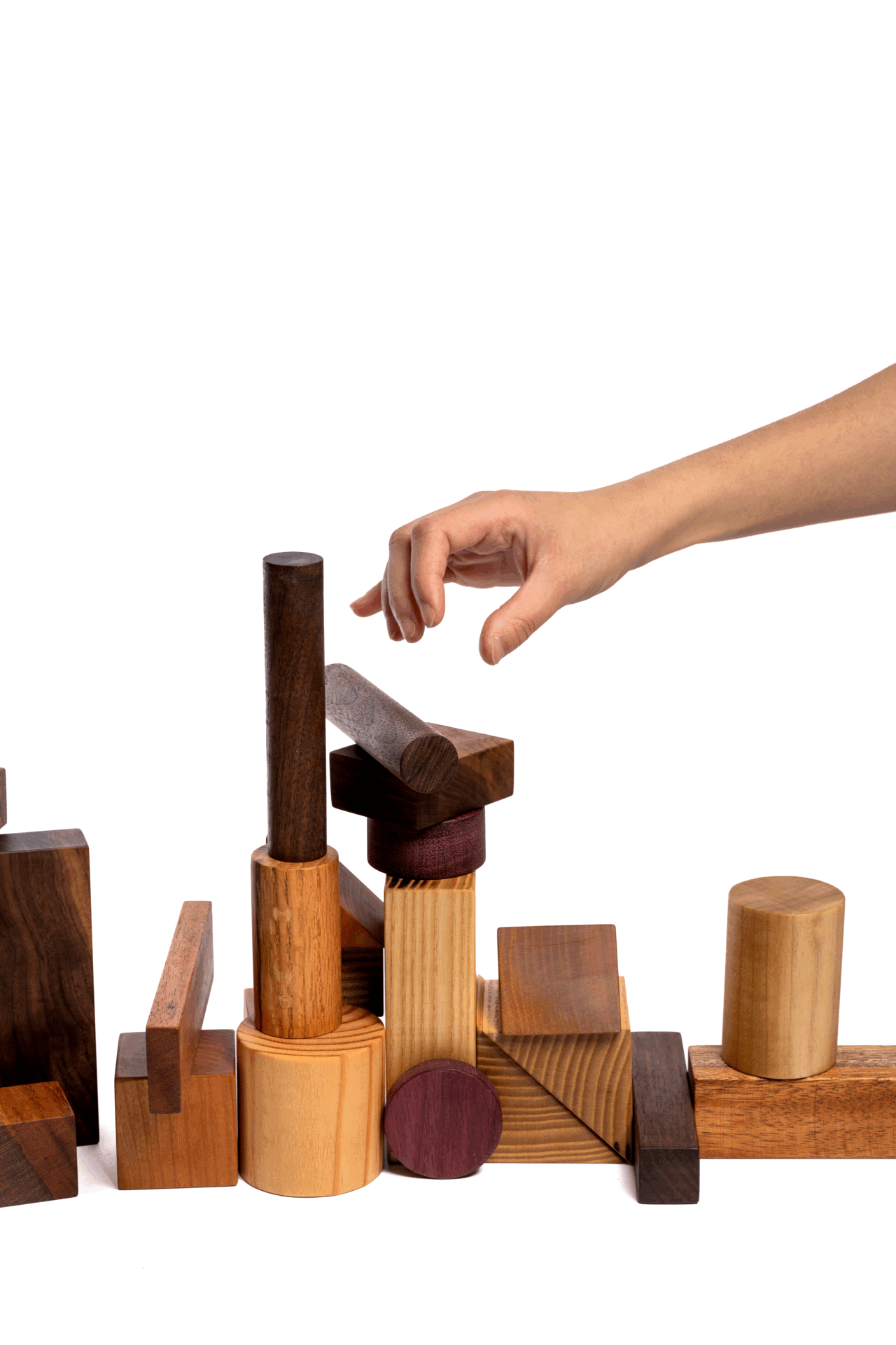 The blocks are various modular dimensions of Cube, Cylinder, Rectangular Prism, and Triangular Prism. Made from various types of wood, locally sourced, each type creates unique haptic feedback due to their distinct color, grain motif, and weight.