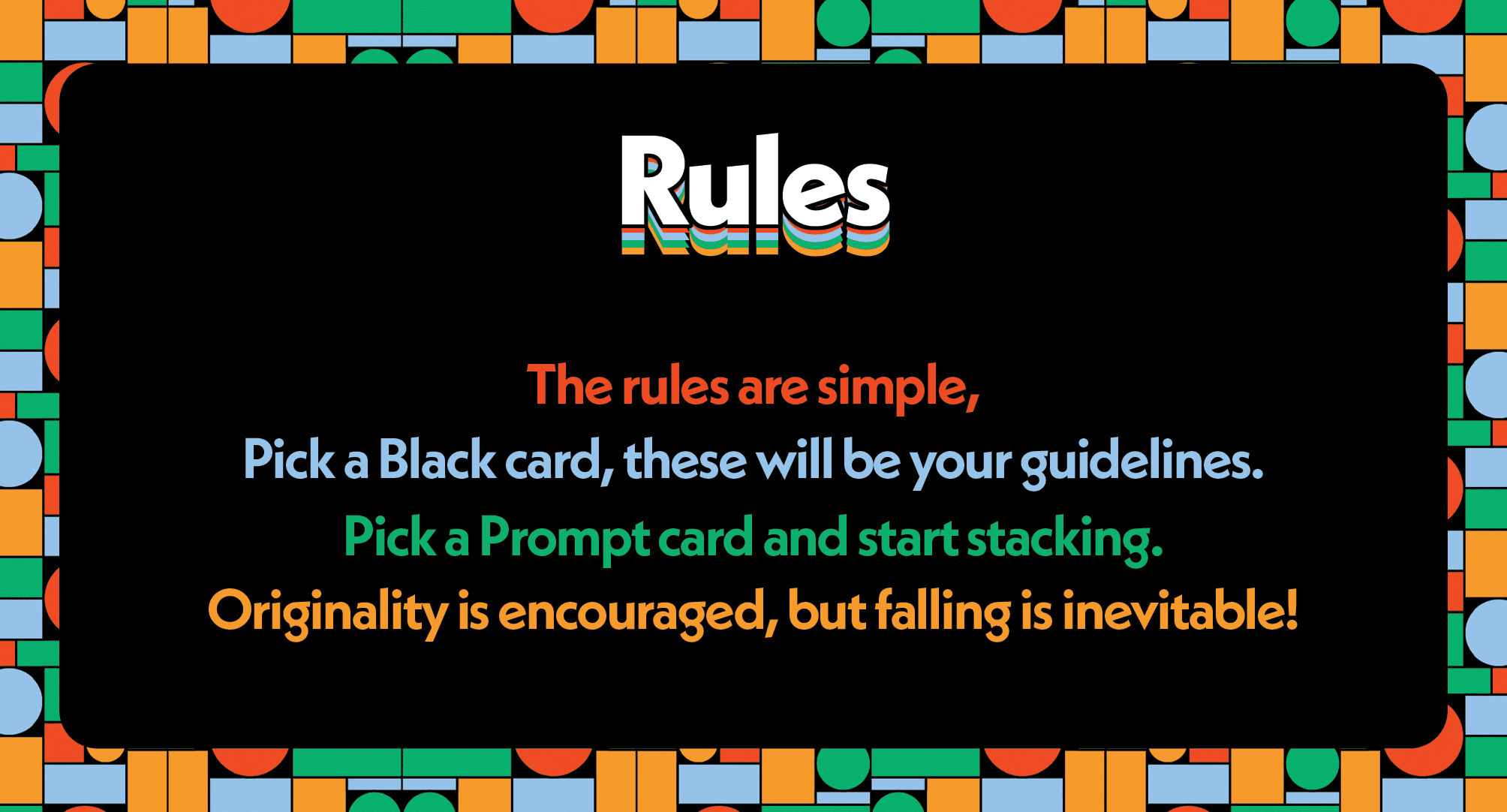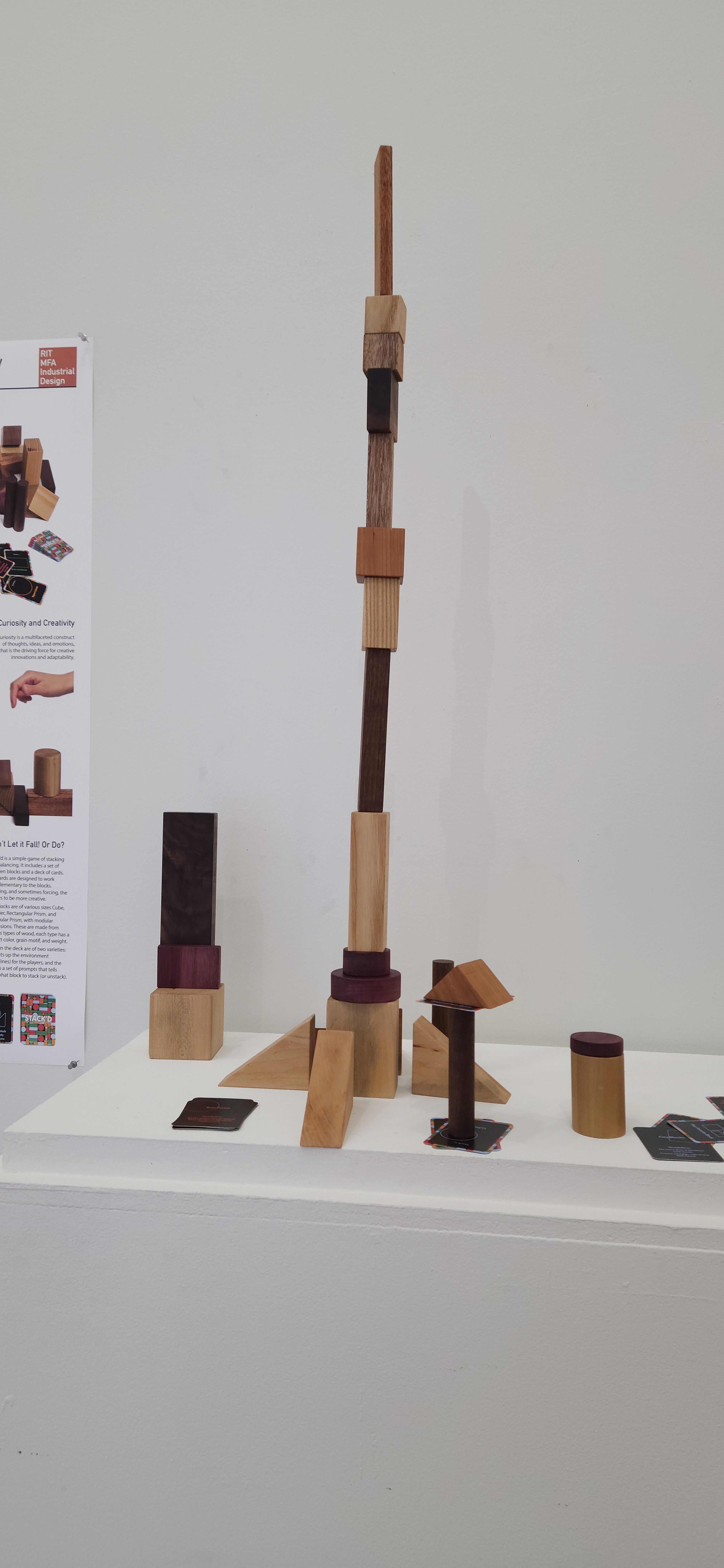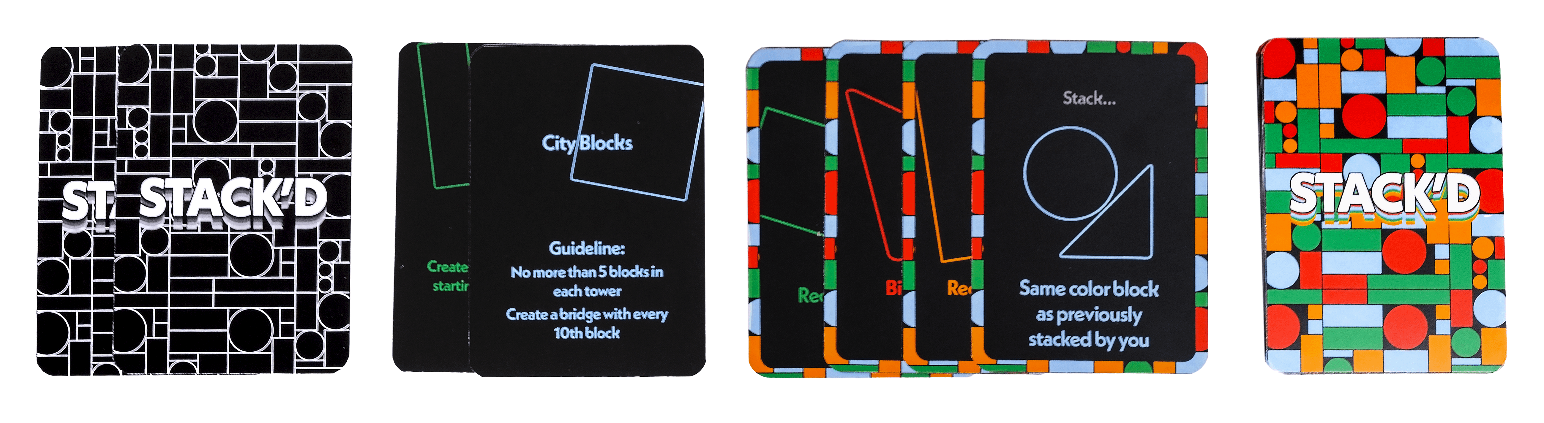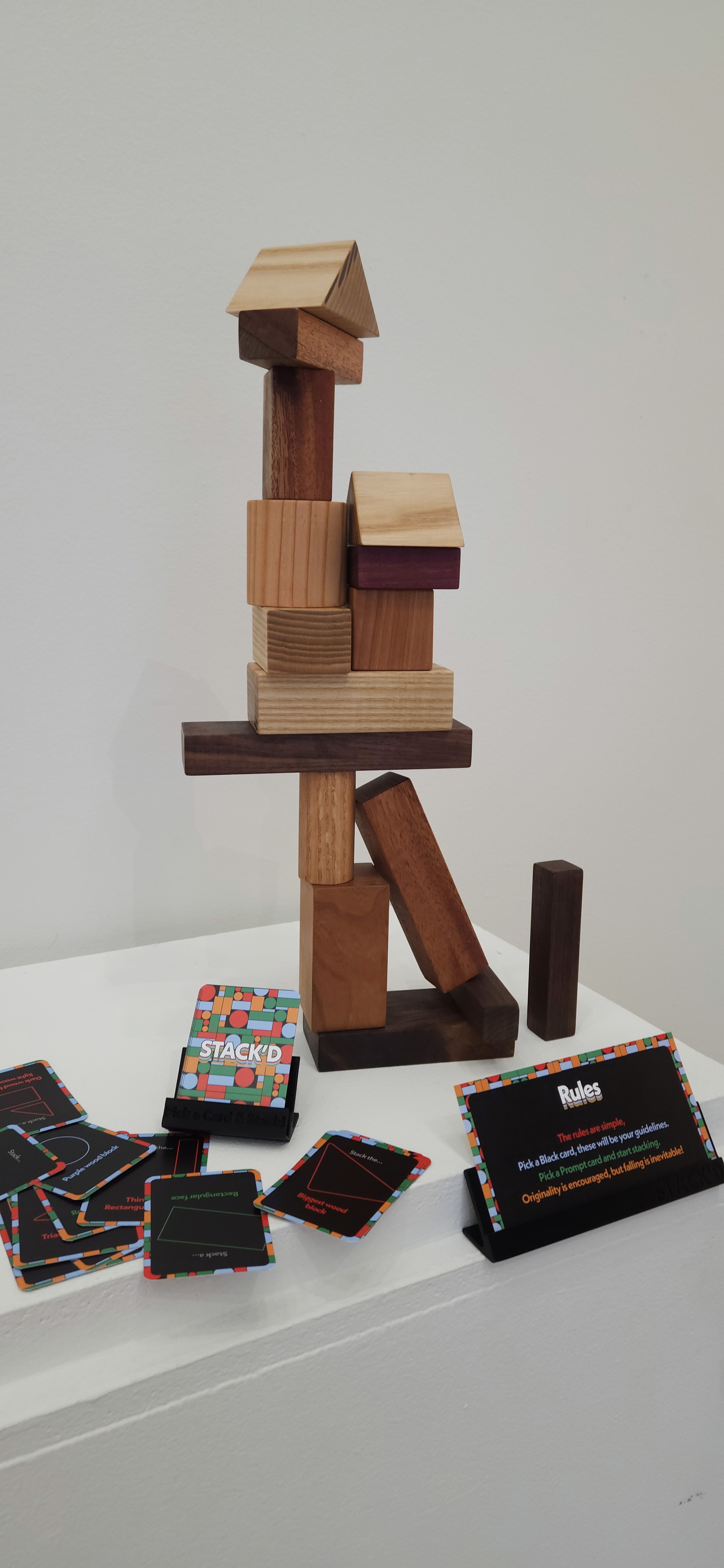 Stack’d is a game of stacking and balancing. It includes a set of wooden blocks and a deck of cards. The cards are designed to work complementary to the blocks. Encouraging, and sometimes forcing, the players to be more creative.
